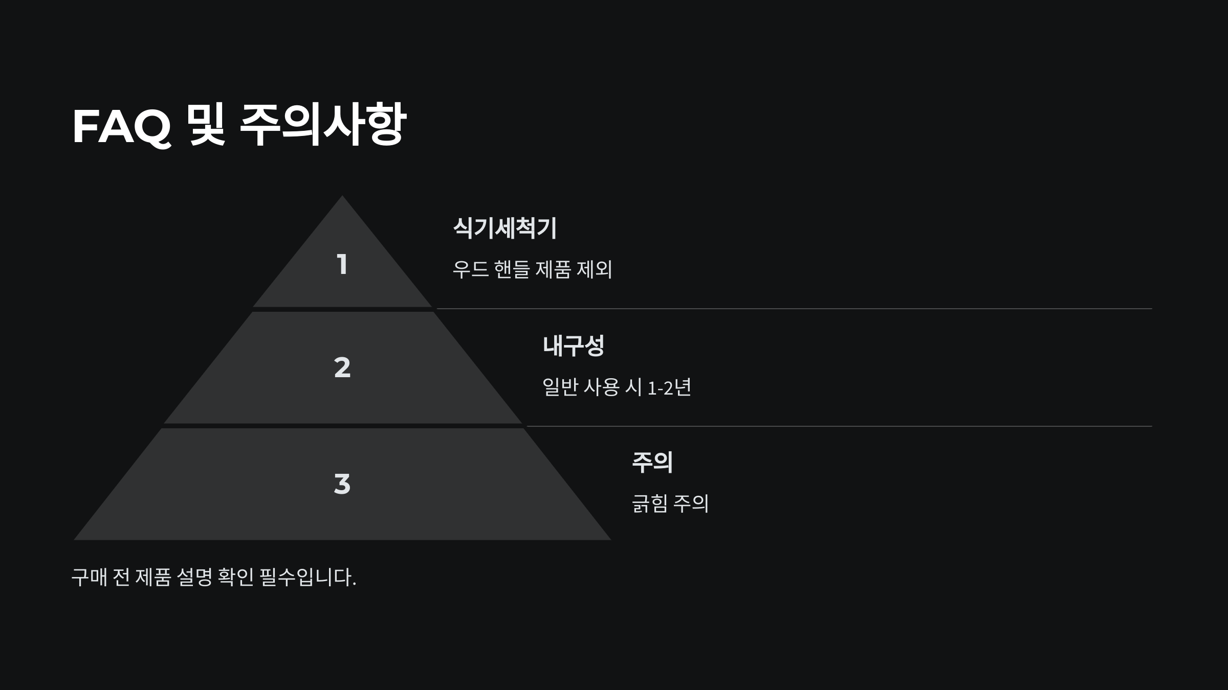 A6. 나무 손잡이는 물에 오래 담가두면 변색되거나 갈라질 수 있어요. 사용 후 바로 닦아서 건조시키는 것이 좋아요. 🌿