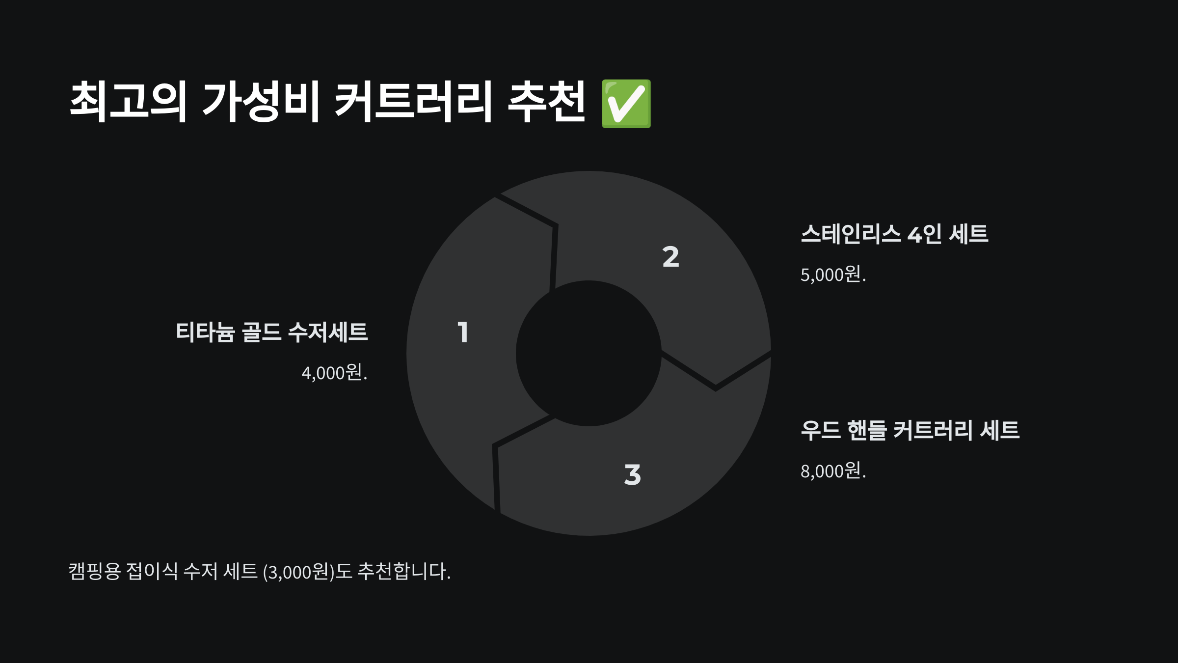 내가 생각했을 때, 가격 대비 만족도가 가장 높은 제품은 스테인리스 포크 & 스푼 세트예요! 가볍고 실용적인 제품을 찾는다면 경량 알루미늄 커트러리도 좋은 선택이죠. 😉