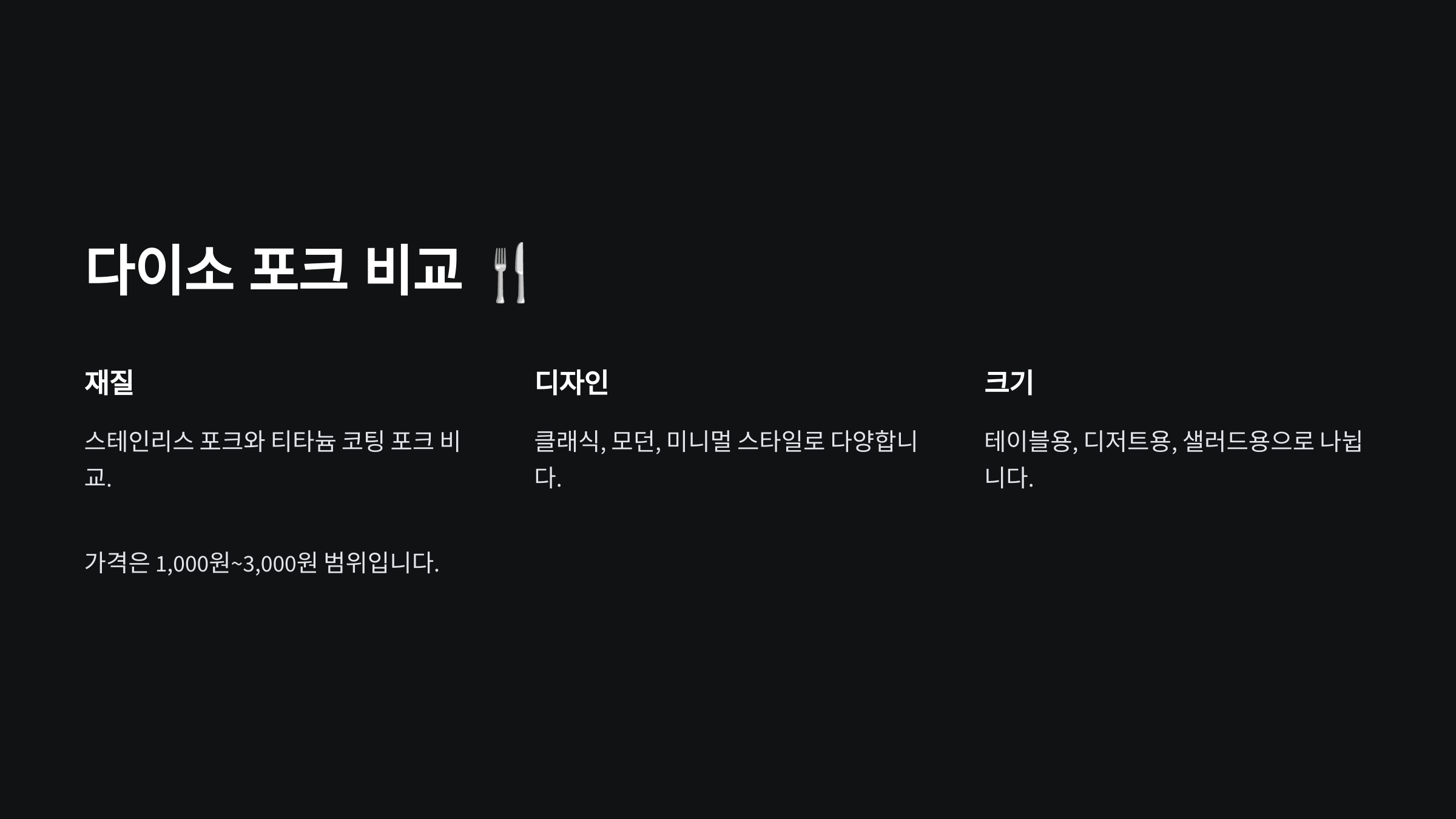 가장 기본적인 1,000원짜리 포크는 가벼워서 휴대하기 좋지만, 내구성은 살짝 아쉬운 편이에요. 반면 3,000원대 제품들은 손잡이가 튼튼하고 디자인이 더 세련됐어요. 고급형 포크는 무게감이 있어 사용감이 훨씬 좋아요. 😍