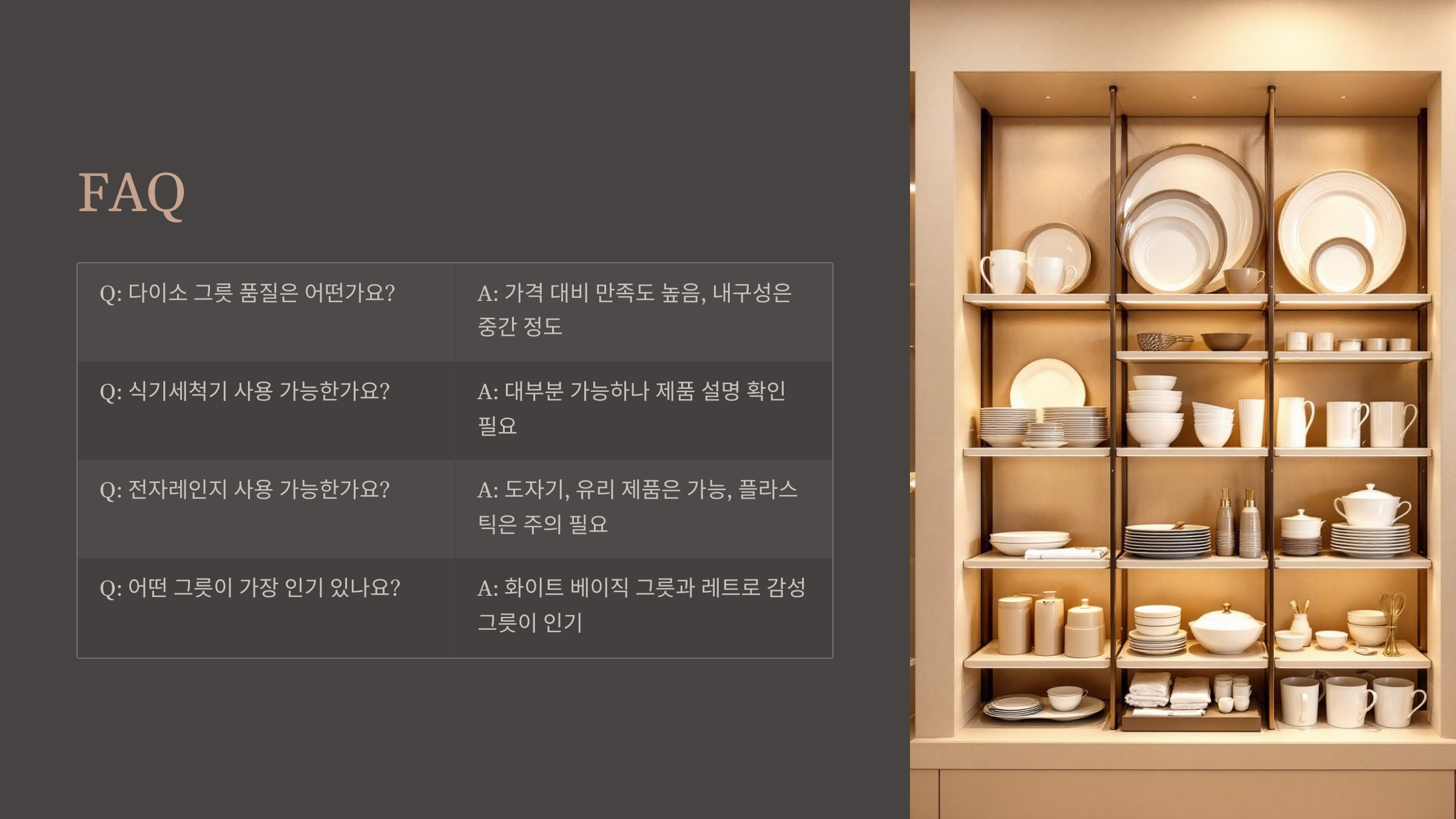 내가 생각했을 때, 다이소 그릇은 감성 플레이팅을 좋아하는 사람들에게 완벽한 선택이에요. 부담 없는 가격으로 예쁜 테이블 세팅이 가능하니까요! 🍽