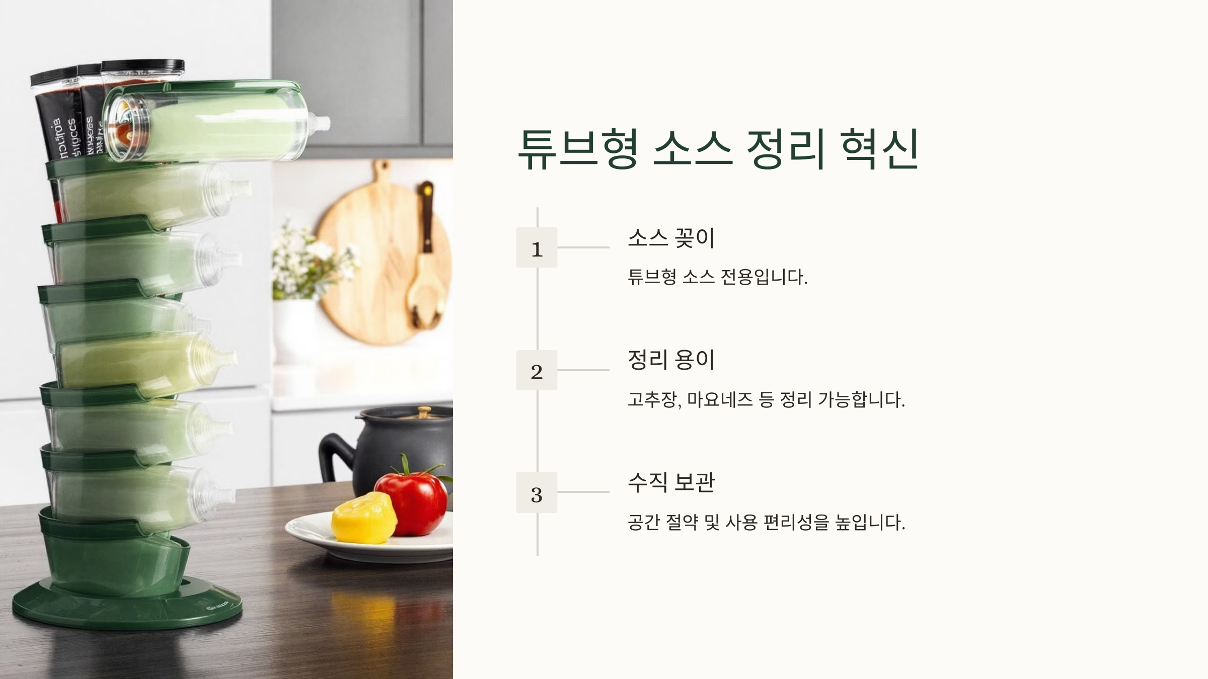 제가 직접 써보니, 냉장고 문 칸이나 선반 위에서 튜브형 소스들이 한 곳에 정리되니까 너무 편리했어요. 찾기도 쉽고, 사용 후 다시 꽂아두기도 간편하더라고요! 🤩