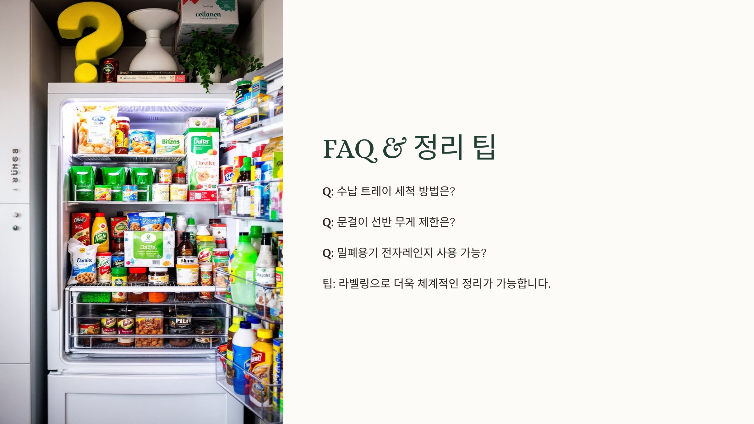 제가 사용해 보니, 냉장고 안이 더 넓어 보이고 작은 물건들이 한눈에 보여서 찾기도 훨씬 쉬워졌어요. 특히 우유팩이나 물병을 문 쪽에 보관하면 공간을 훨씬 더 넉넉하게 활용할 수 있어요. 🚀