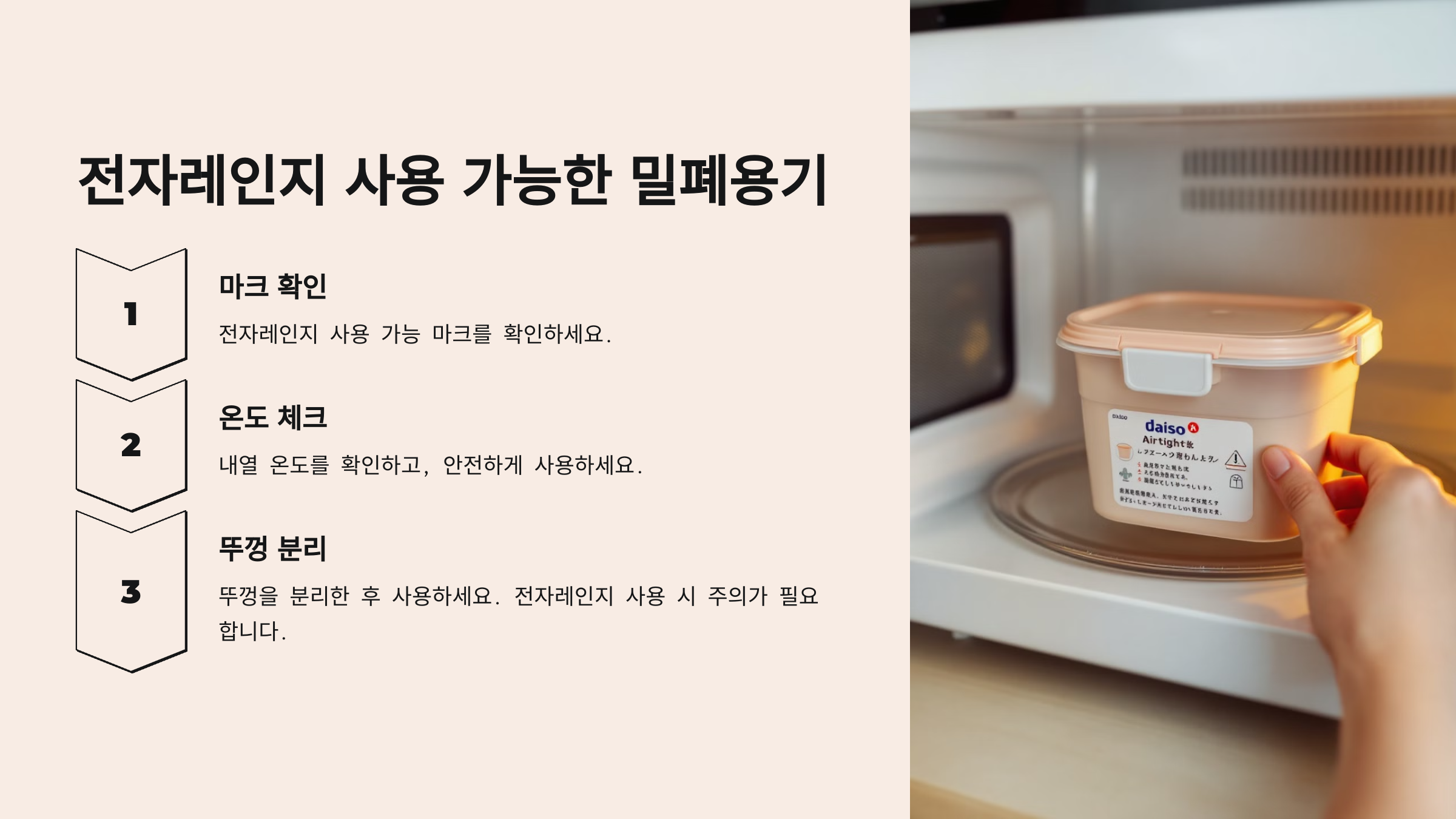 밀폐용기를 사용할 때 전자레인지 사용 가능 여부도 중요한 요소예요. 다이소에서는 전자레인지 사용이 가능한 밀폐용기도 다양하게 판매하고 있어요. 하지만 뚜껑을 덮은 채로 가열하면 압력 때문에 터질 수 있으니 반드시 뚜껑을 살짝 열어야 해요! ⚠
