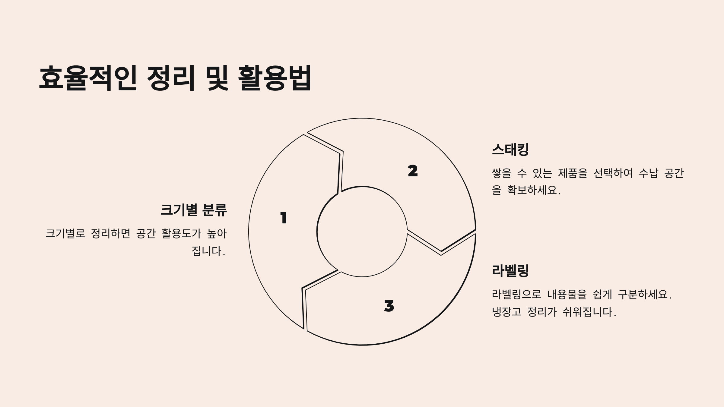 정리 방법 설명 크기별 정리 큰 용기는 아래, 작은 용기는 위로 쌓아서 정리 라벨링 활용 반찬 이름과 만든 날짜를 적어 신선도 체크 종류별 분류 국물, 나물, 볶음 반찬 등 카테고리별 정리 수직 정리 냉장고 칸막이를 활용해 세워서 보관 라벨링을 활용하면 반찬을 헷갈리지 않고 신선도를 쉽게 체크할 수 있어요! 특히 만든 날짜를 적어두면 유통기한을 관리하기 편리하답니다. 🏷