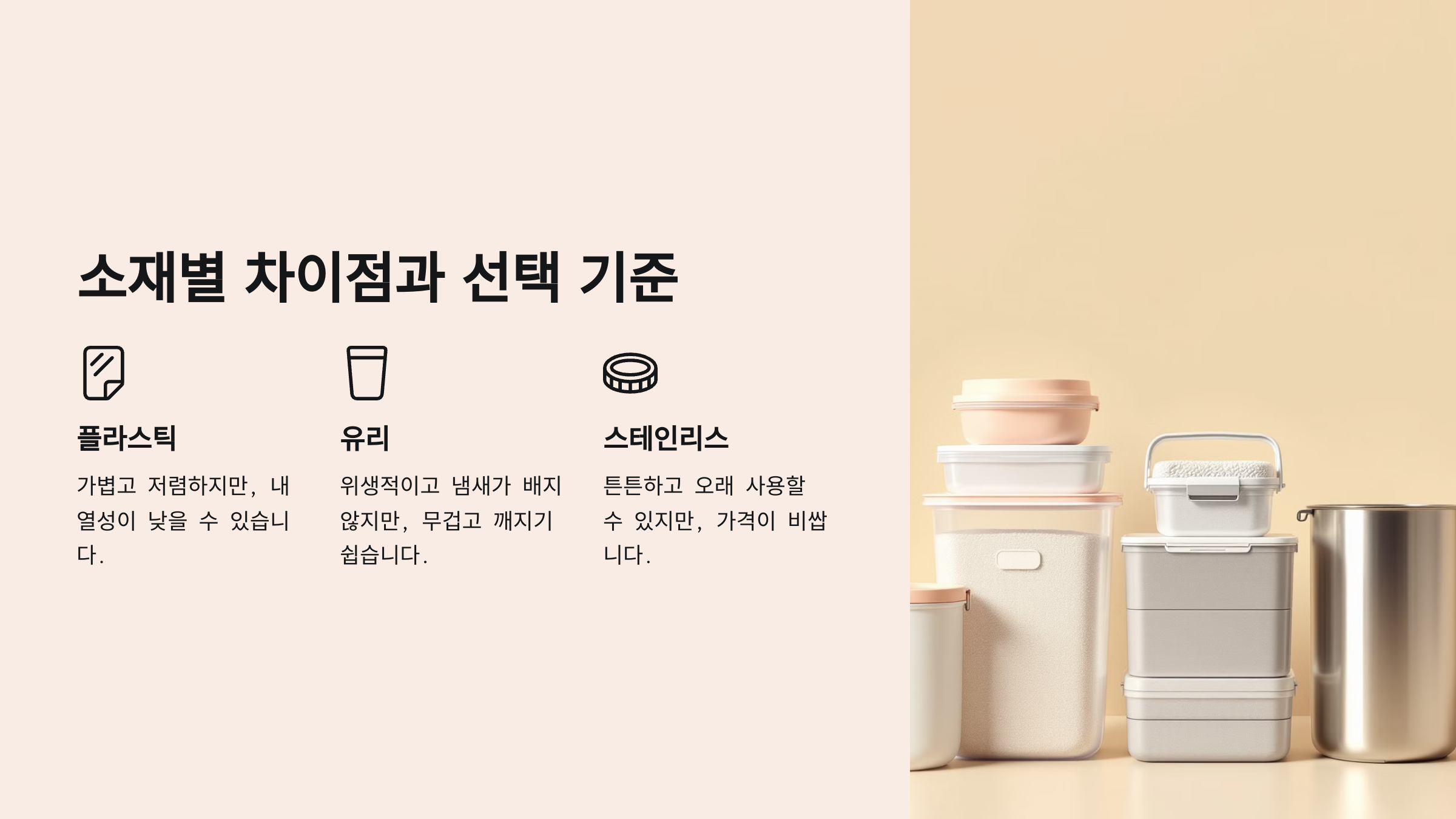 예를 들어, 플라스틱 밀폐용기는 가볍고 가격이 저렴하지만, 뜨거운 음식을 보관할 때 환경호르몬 걱정이 있을 수 있어요. 반면 유리 밀폐용기는 무겁지만 내구성이 뛰어나고 전자레인지 사용이 가능하죠! 🍱
