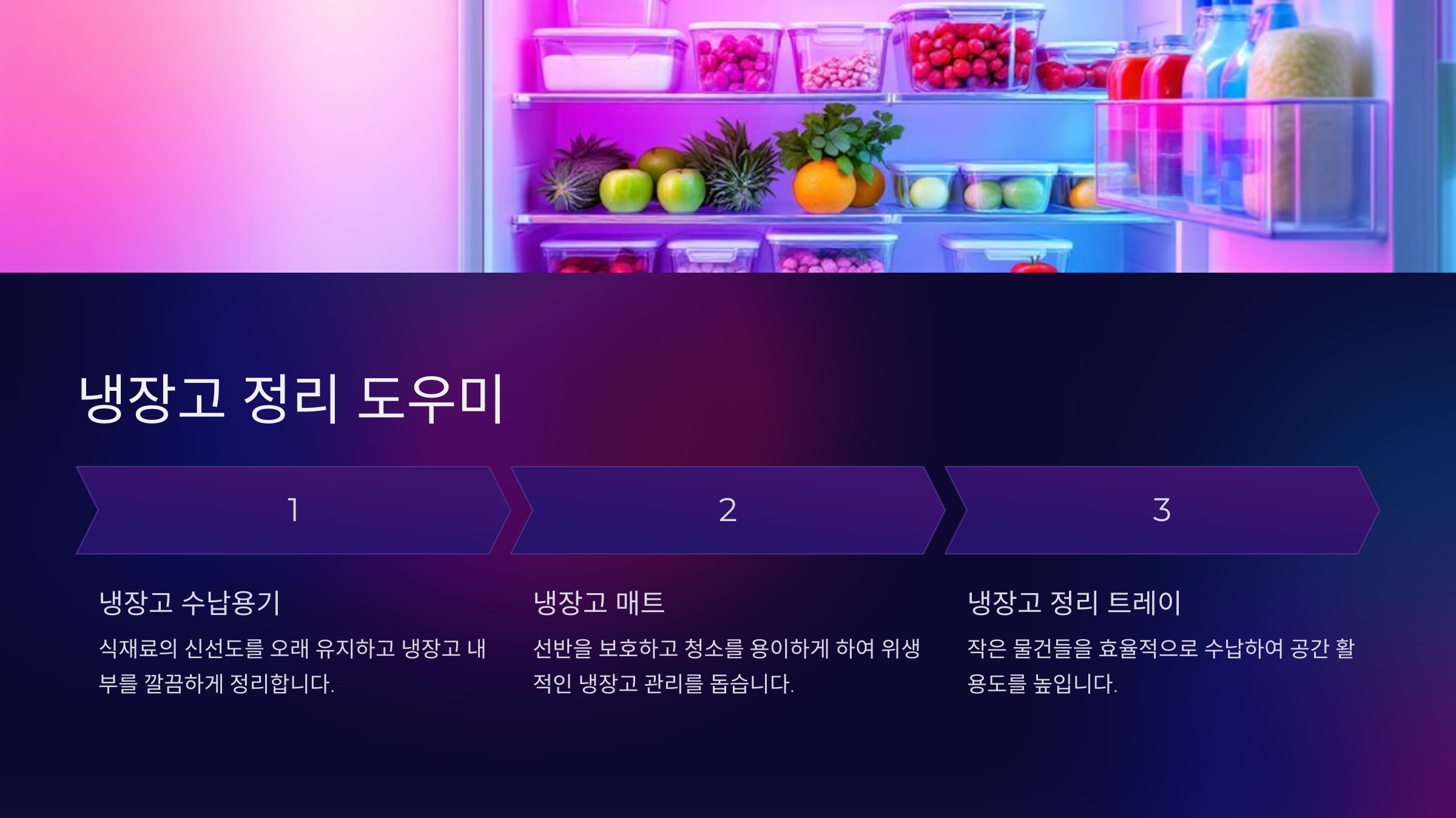 제품명 특징 활용도 냉장고 정리 바스켓 식재료를 깔끔하게 분류 가능 ★★★★★ 계란 보관함 계란을 안정적으로 보관 가능 ★★★★☆ 냉장고 틈새 선반 공간 활용 극대화 ★★★★★ 밀폐용기 세트 식재료 신선도 유지 ★★★★☆ 이제 냉장고 속도 깔끔해졌다면, 마지막으로 식기 및 조리도구 정리템을 소개할게요! 🍽
