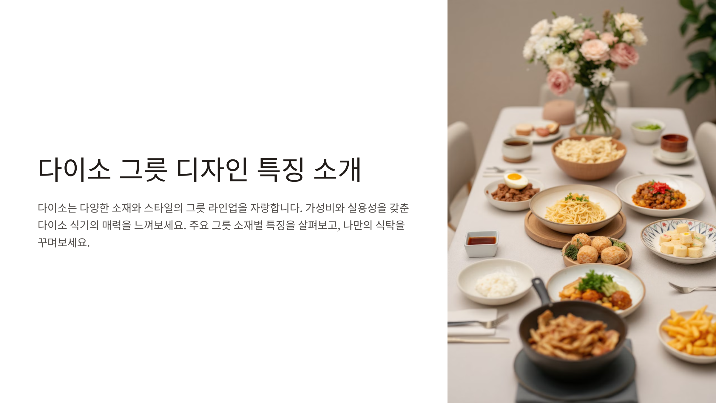 다이소의 식기는 저렴하지만, 디자인이 굉장히 감각적이에요. 최근에는 카페 감성, 빈티지 스타일, 미니멀리즘 디자인 등이 많이 나와서 트렌디한 식탁을 연출하기 좋아요.