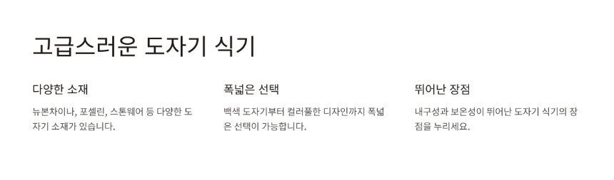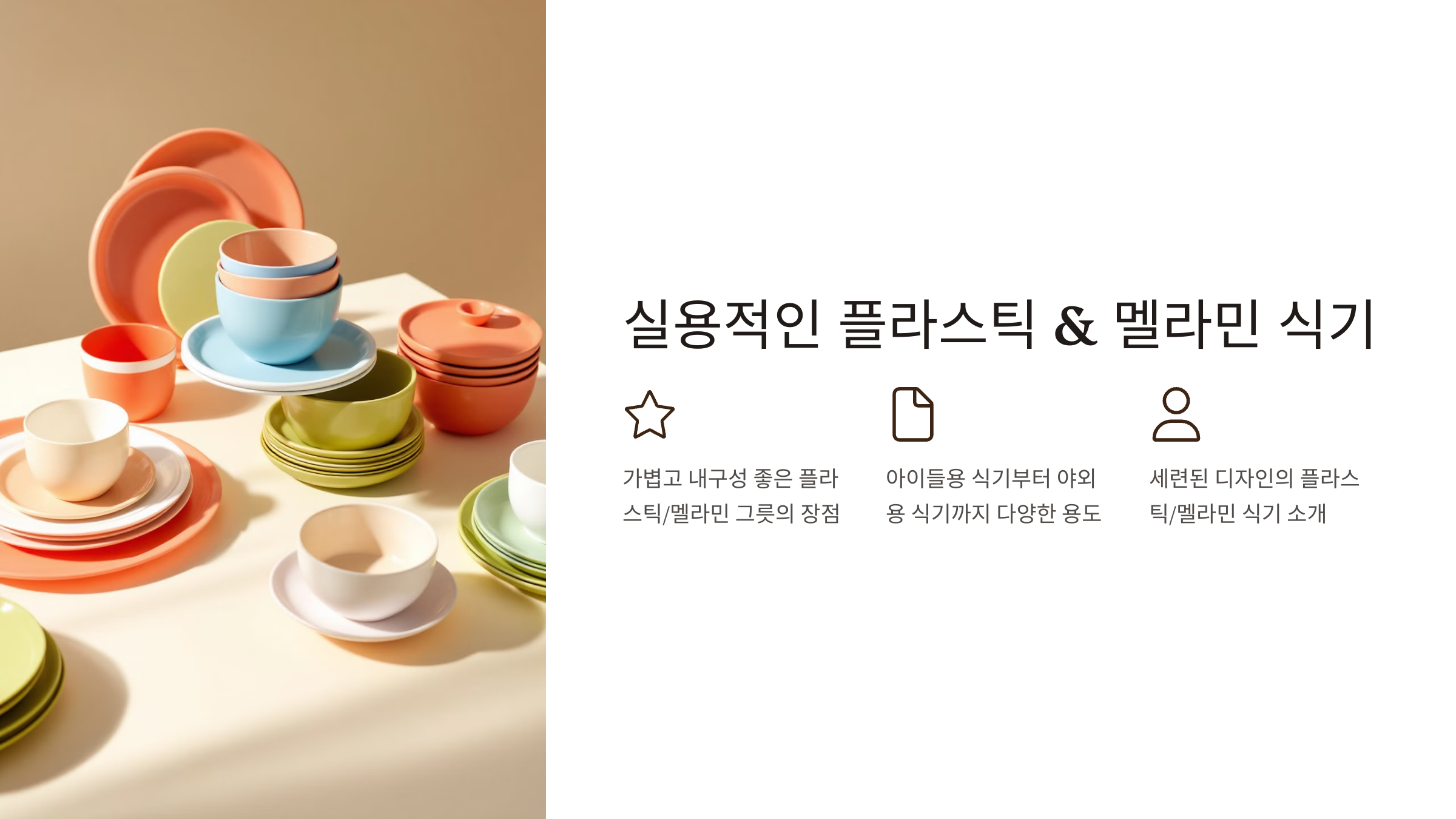 상품명 특징 추천 용도 우드 플레이트 무광 나무 질감, 자연스러운 색감 브런치, 디저트 플레이팅 우드 손잡이 머그 따뜻한 감성 디자인, 견고한 손잡이 커피, 차, 라떼 우드 트레이 다용도로 활용 가능, 깔끔한 마감 홈카페, 브런치 서빙 다음은 실용적인 플라스틱 & 멜라민 식기를 소개할게요! 🥄