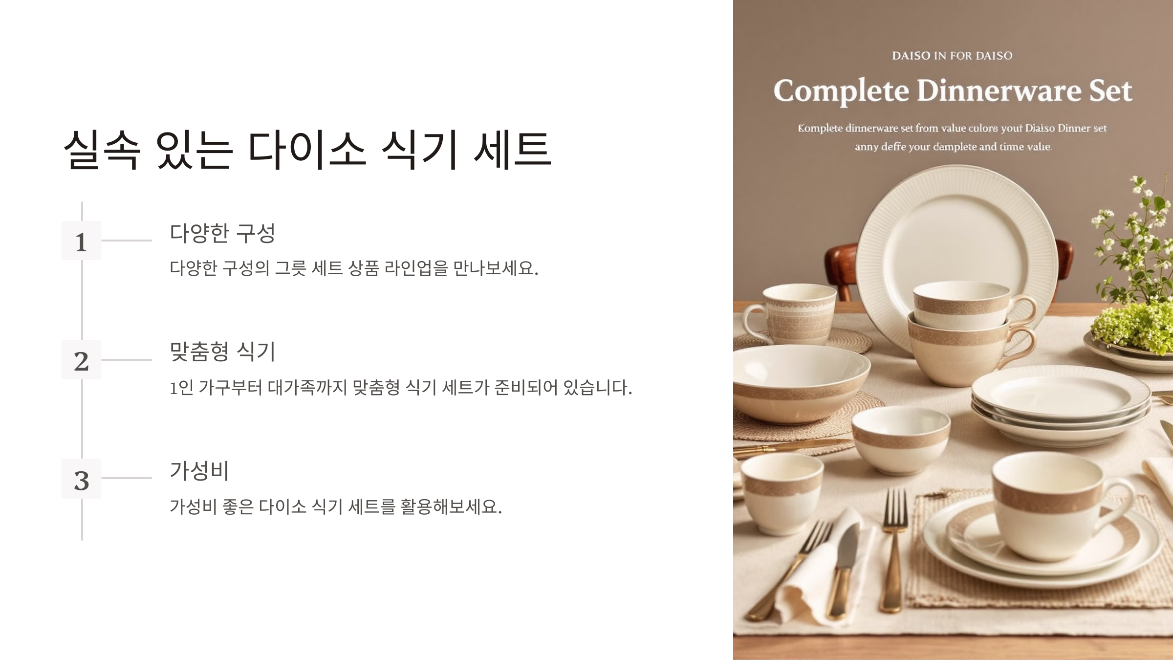 다이소에서는 단품 식기뿐만 아니라, 세트로 구성된 제품들도 많아요. 특히 기본적인 식기를 한 번에 맞춰서 구매하고 싶다면 세트 제품을 선택하는 게 좋아요! 🍵