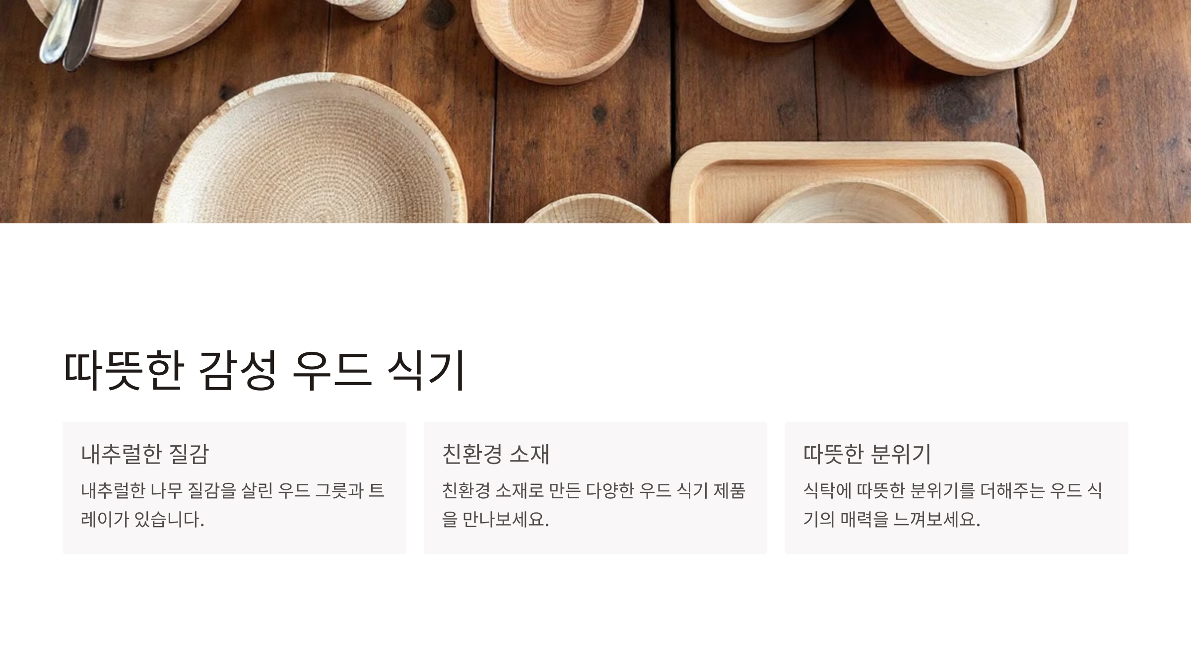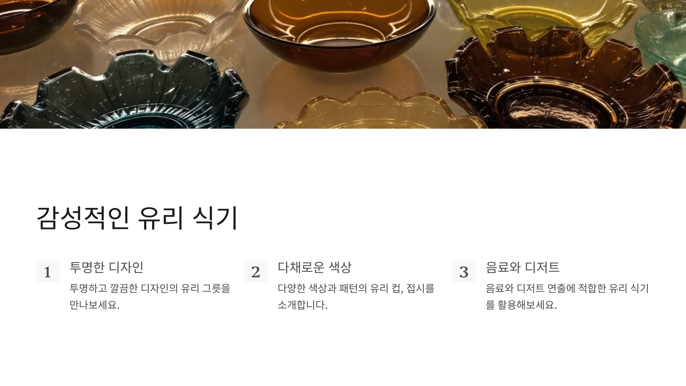 상품명 특징 추천 용도 엔틱 유리컵 빈티지 패턴과 투명한 디자인 커피, 주스, 칵테일 볼록 패턴 유리 접시 둥근 패턴과 앤틱한 무드 디저트, 샐러드 모던 유리 보울 깔끔한 투명 디자인 시리얼, 과일 다음은 따뜻한 감성의 우드 식기를 소개할게요! 🌿