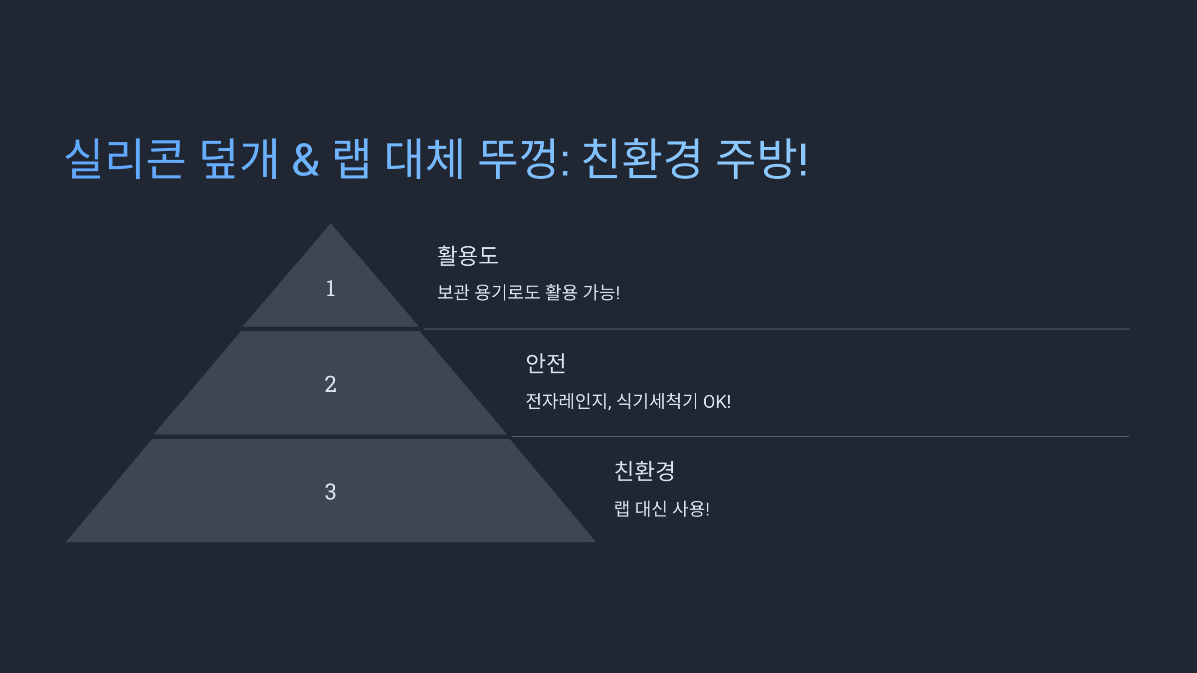 제품명 가격 특징 실리콘 만능 덮개 (3개 세트) ₩5,000 다양한 크기로 그릇 크기에 맞게 사용 가능 전자레인지용 실리콘 뚜껑 ₩3,000 전자레인지 사용 시 음식물 튐 방지 제가 생각했을 때, 다이소 실리콘 덮개는 랩 대용으로 정말 좋은 제품이에요! 💡 환경도 지키고, 가성비까지 챙길 수 있어서 주방 필수템으로 강력 추천해요! 😆