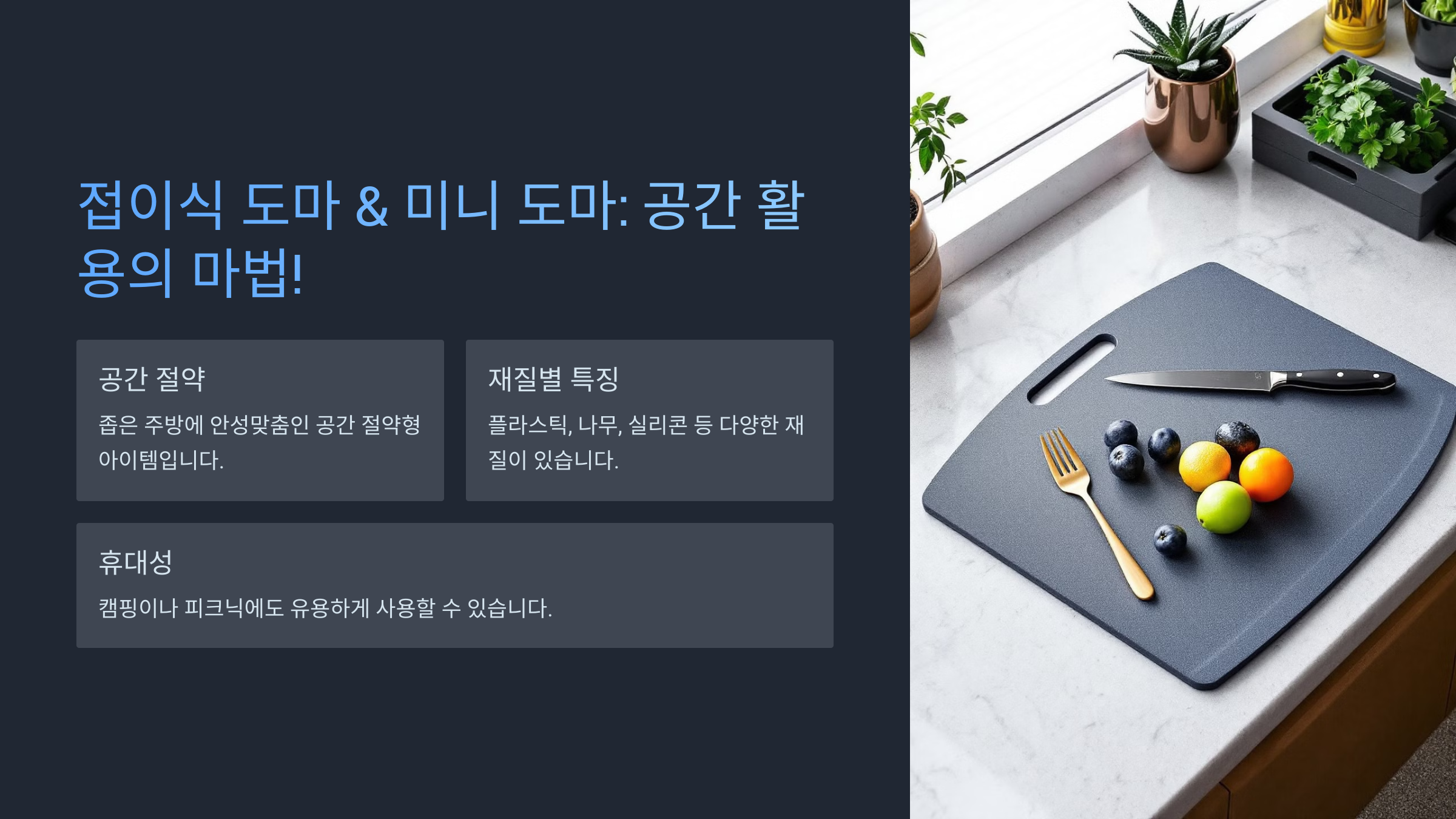 - 접이식 도마는 사용 후 접어서 보관하면 주방 공간을 절약할 수 있어요.