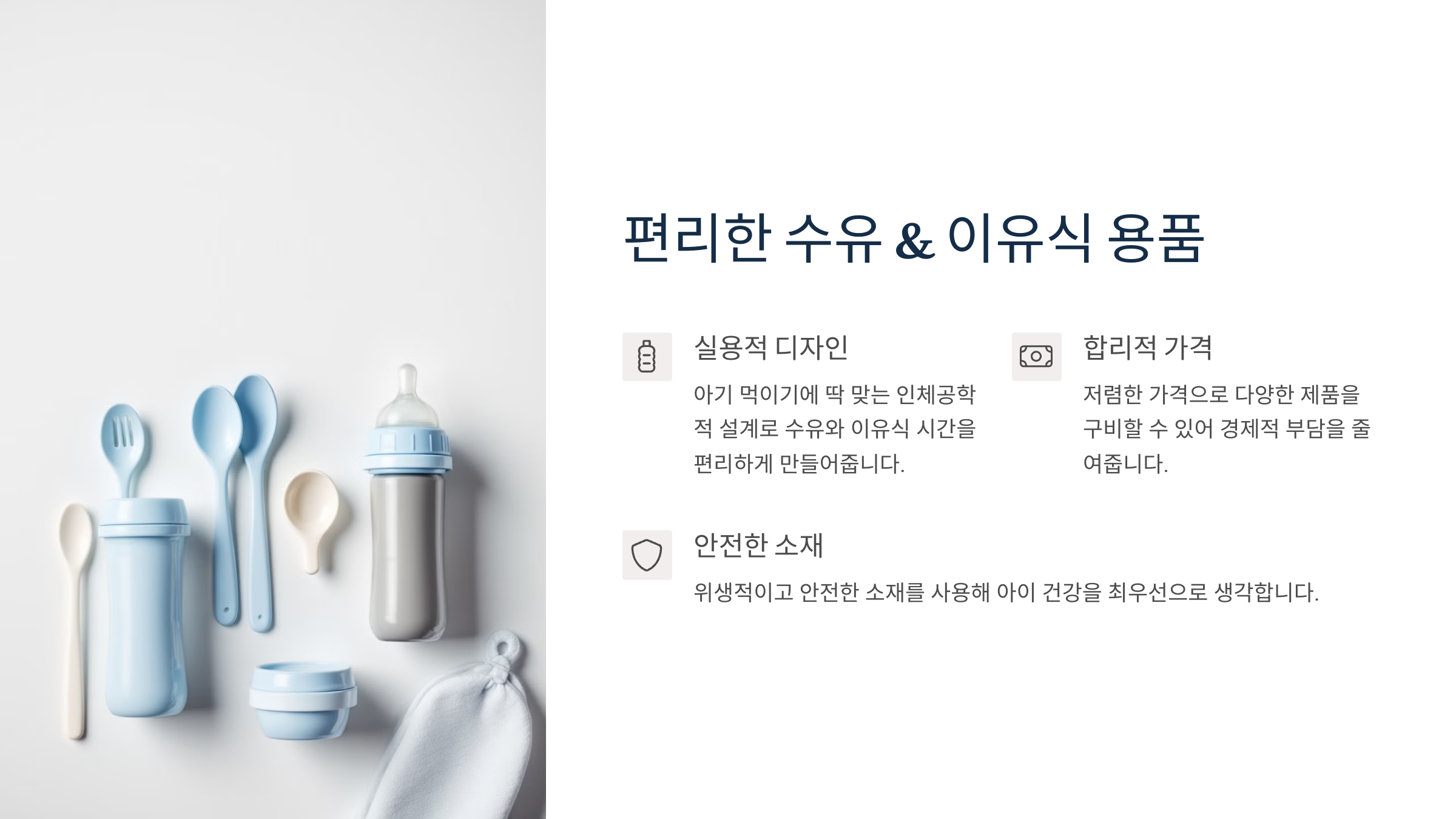 제품명 특징 추천 용도 가격대 실리콘 턱받이 물세 가능 & 음식 흘림 방지 이유식 & 간식 시간 3,000원~5,000원 안전 모서리 보호대 부드러운 소재 & 충격 흡수 테이블 & 가구 모서리 보호 2,000원~4,000원 휴대용 기저귀 파우치 기저귀 & 물티슈 보관 가능 외출 시 필수템 3,000원~6,000원 이제 아이 키우기가 더 편리해질 준비 완료! 😊 다음은 편리한 수유 & 이유식 용품 추천을 소개할게요!