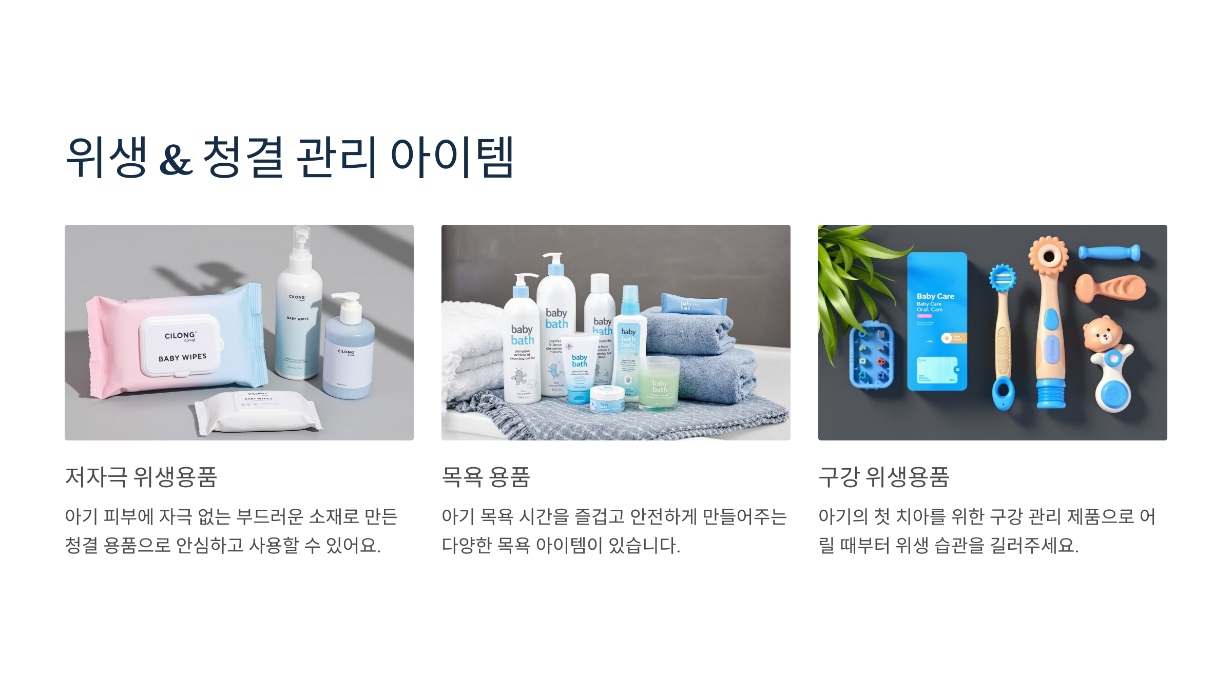 제품명 특징 추천 용도 가격대 모서리 보호대 부드러운 소재 & 충격 흡수 테이블 & 가구 모서리 보호 2,000원~4,000원 콘센트 보호 커버 감전 사고 방지 콘센트 안전 관리 1,000원~3,000원 미끄럼 방지 매트 바닥 밀림 방지 & 안정적인 고정 욕실, 주방, 놀이방 3,000원~6,000원 이제 집에서도 안전하게 아기를 돌볼 수 있겠죠? 😊 다음은 위생 & 청결 관리 아이템을 소개할게요!