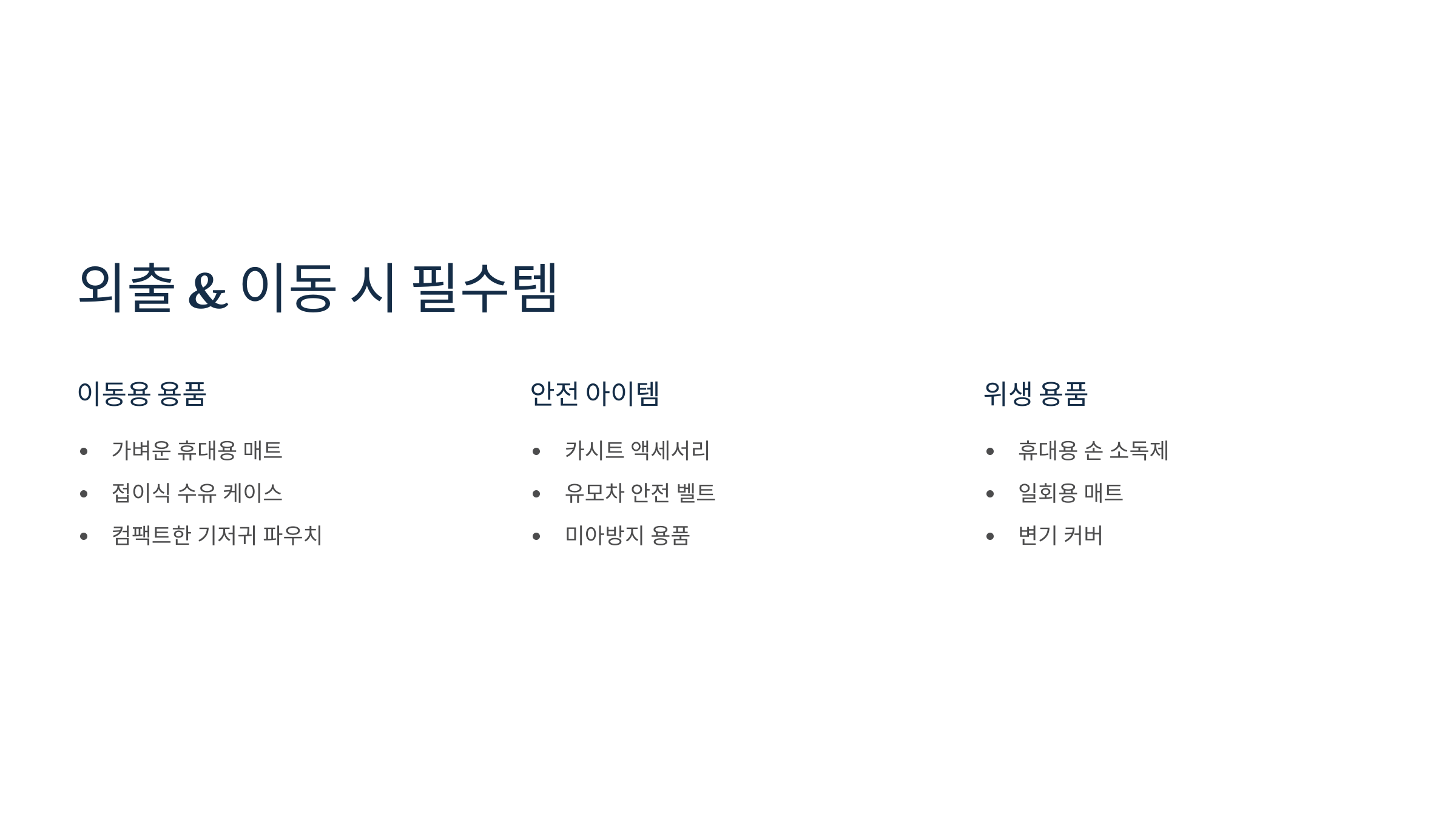 A3. 휴대용 기저귀 파우치, 흡착형 이유식 용기, 아기 목 보호 쿠션이 있으면 훨씬 편해요.