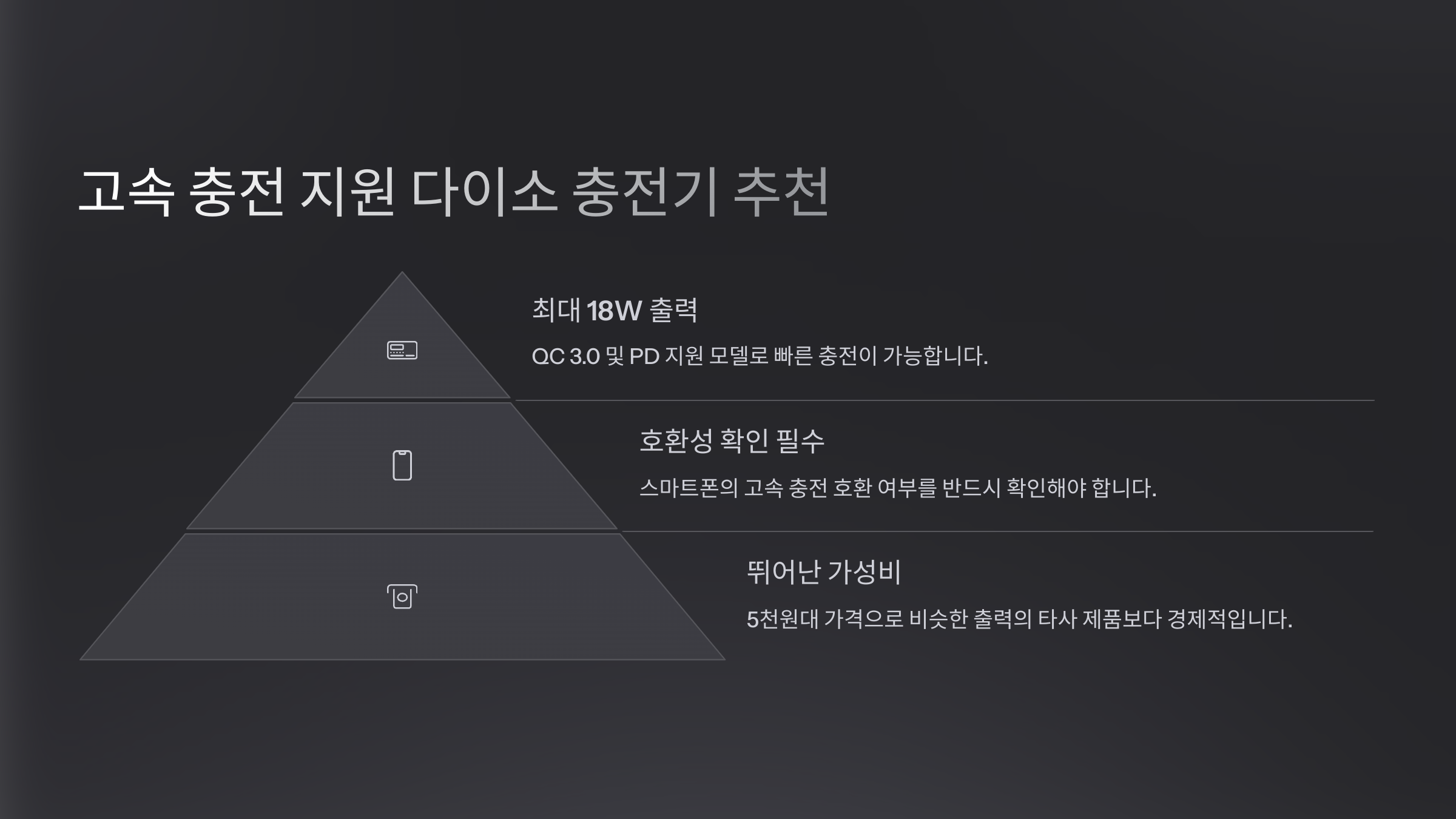 제품명 출력 지원 기능 가격 PD 지원 USB-C 충전기 18W 아이폰 & 갤럭시 고속 충전 5,000원 QC 3.0 지원 충전기 18W 안드로이드 고속 충전 5,000원 듀얼 포트 PD+QC 충전기 20W USB-C & USB-A 동시 충전 7,000원 내가 생각했을 때, 5,000원대 PD 충전기는 가성비가 정말 좋아요! 🔥 아이폰 유저라면 USB-C PD 충전기를, 안드로이드 유저라면 QC 지원 충전기를 추천해요. 📱✨