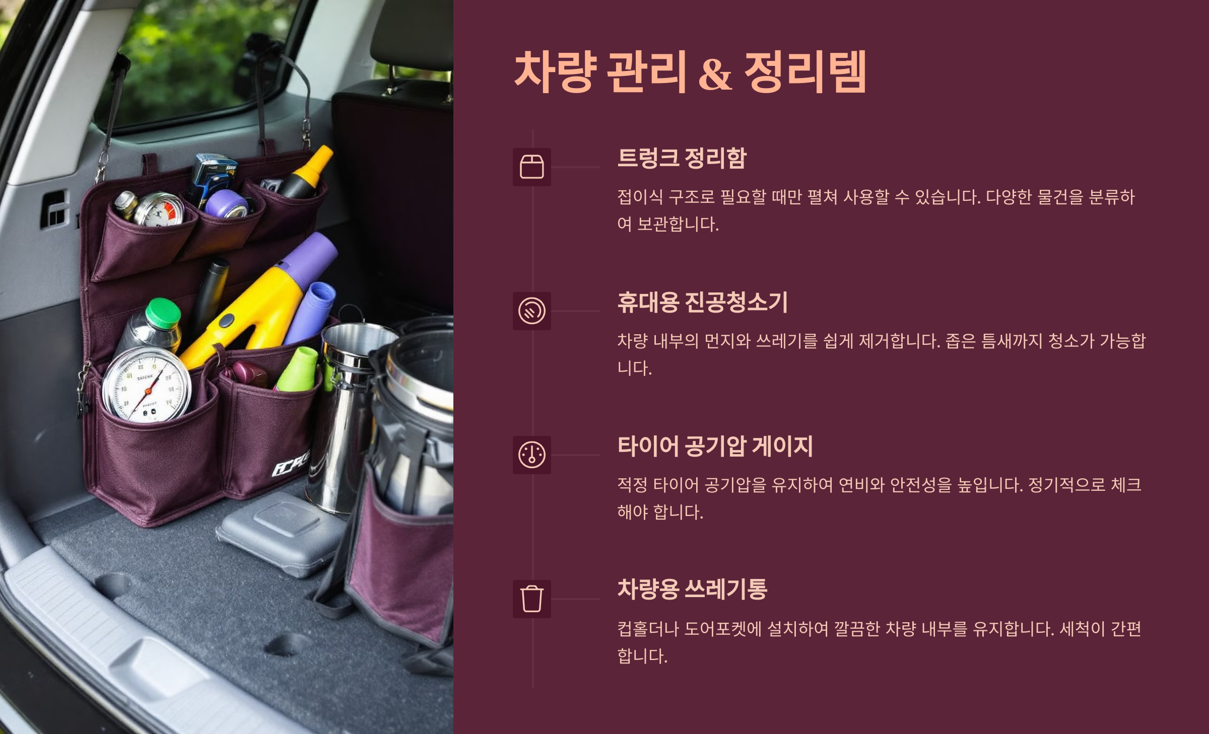 ✔ 차량용 정리함: 트렁크나 뒷좌석에 소지품을 깔끔하게 보관할 수 있는 필수템! 접이식 제품도 있어 공간 활용도가 높아요. 📦