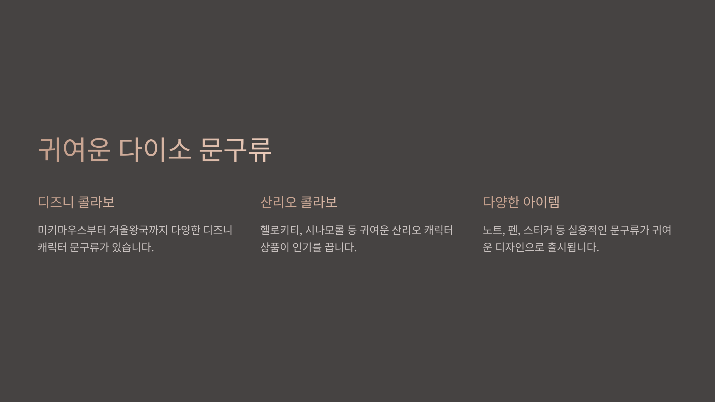 제품명 특징 추천 용도 가격 캐릭터 볼펜 귀여운 디자인, 부드러운 필기감 공부, 다이어리 꾸미기 ₩1,000~₩3,000 다이어리 스티커 다양한 캐릭터 디자인 다이어리 꾸미기, 데코 ₩1,000~₩2,000 떡메모지 점착형 아님, 다양한 사이즈 메모, 선물 메시지 ₩1,000 캐릭터 문구류는 공부와 업무를 좀 더 즐겁게 만들어 주는 아이템이에요! 귀여운 문구들을 모아보는 재미도 쏠쏠하답니다. ✏✨