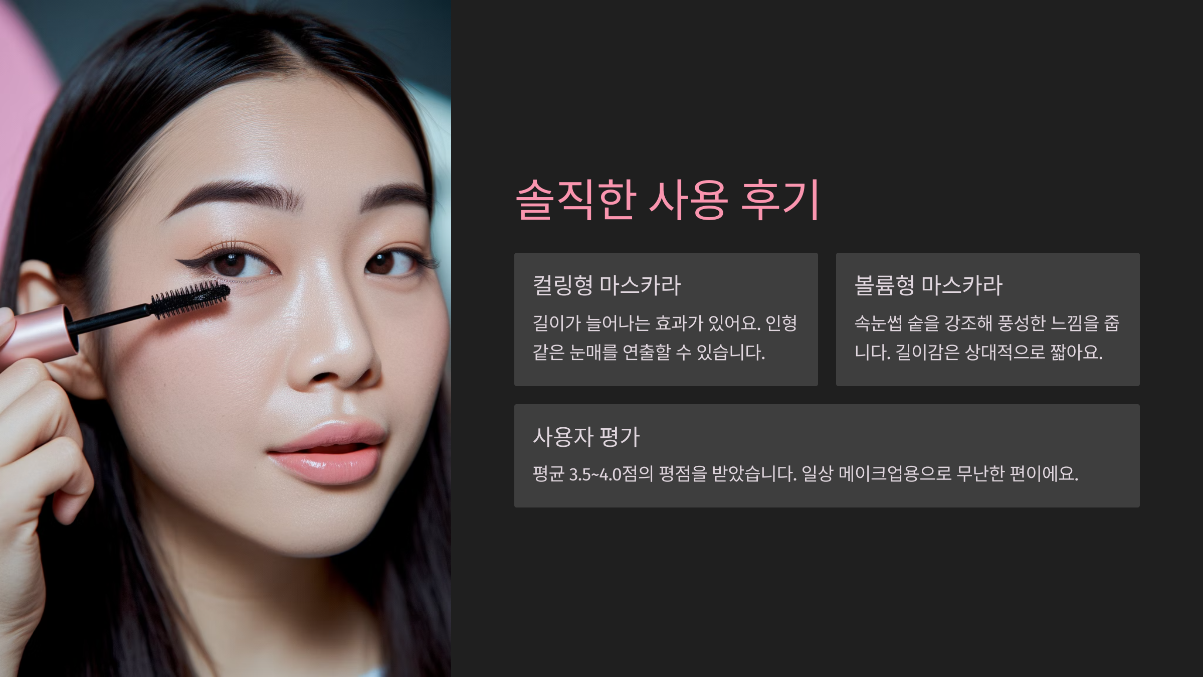 사용자 평가 한 줄 후기 @beauty_jina ⭐⭐⭐⭐ 컬링력 대박! 단, 오후엔 살짝 번짐. @makeup_lover ⭐⭐⭐ 속눈썹 길어 보이는데, 지속력은 보통. @daily_grace ⭐⭐⭐⭐⭐ 가격 대비 최고! 데일리용으로 강추! 사용자들의 평가를 보면 전반적으로 "가격 대비 괜찮다"는 의견이 많아요. 하지만 지속력이나 번짐 문제는 사람마다 차이가 있네요. 다음으로 가장 추천하는 제품 TOP 3를 알아볼까요? 😆