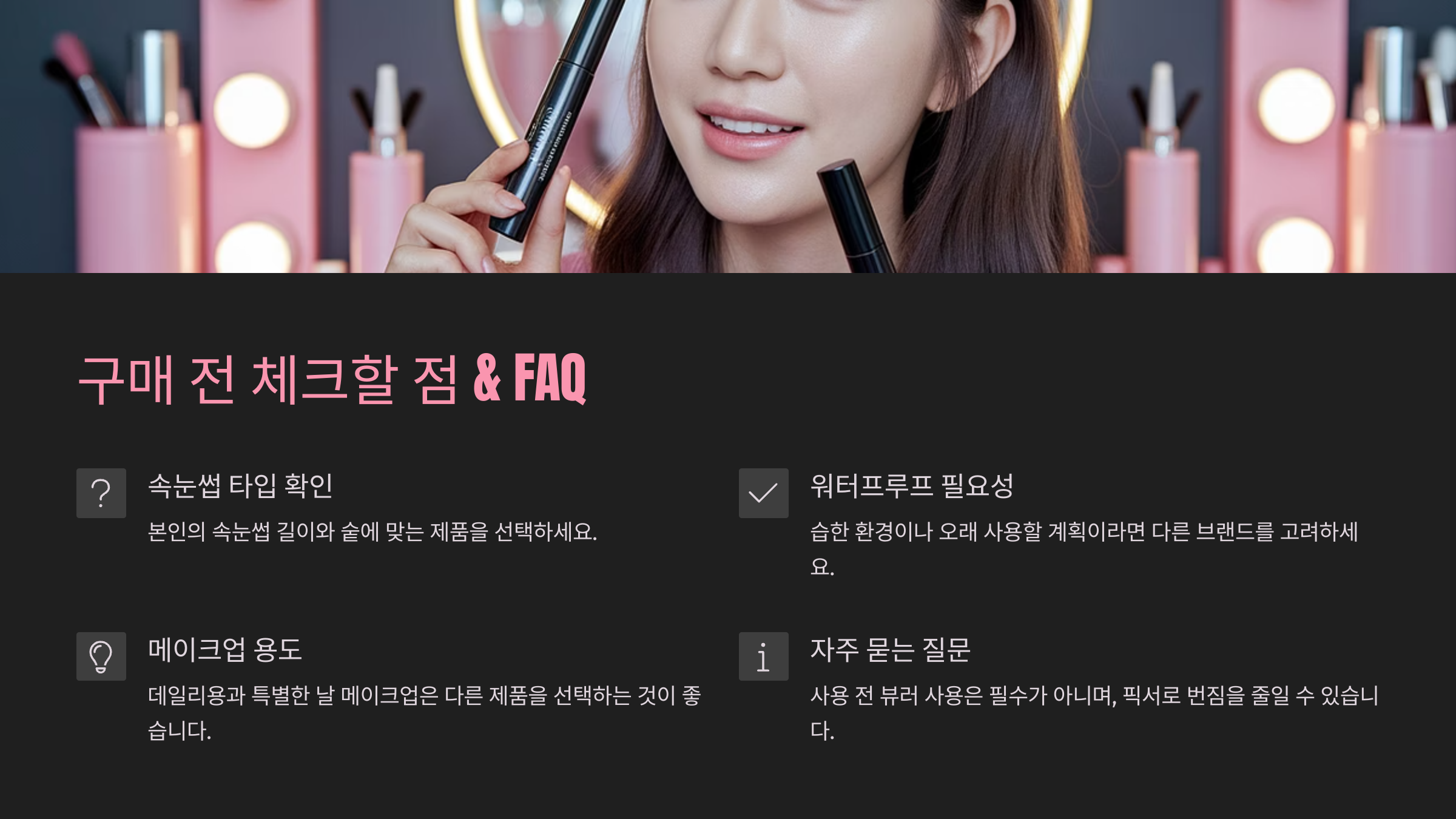 - 💁♀️ 원하는 효과를 먼저 정하기: 볼륨? 롱래쉬? 컬링? 본인에게 맞는 제품을 선택하세요.