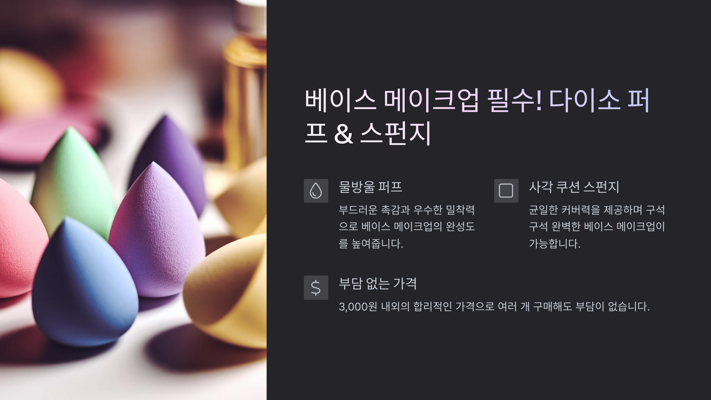 이제 다이소 퍼프 & 스펀지로 더 완벽한 베이스 메이크업을 연출해보세요! 💖✨