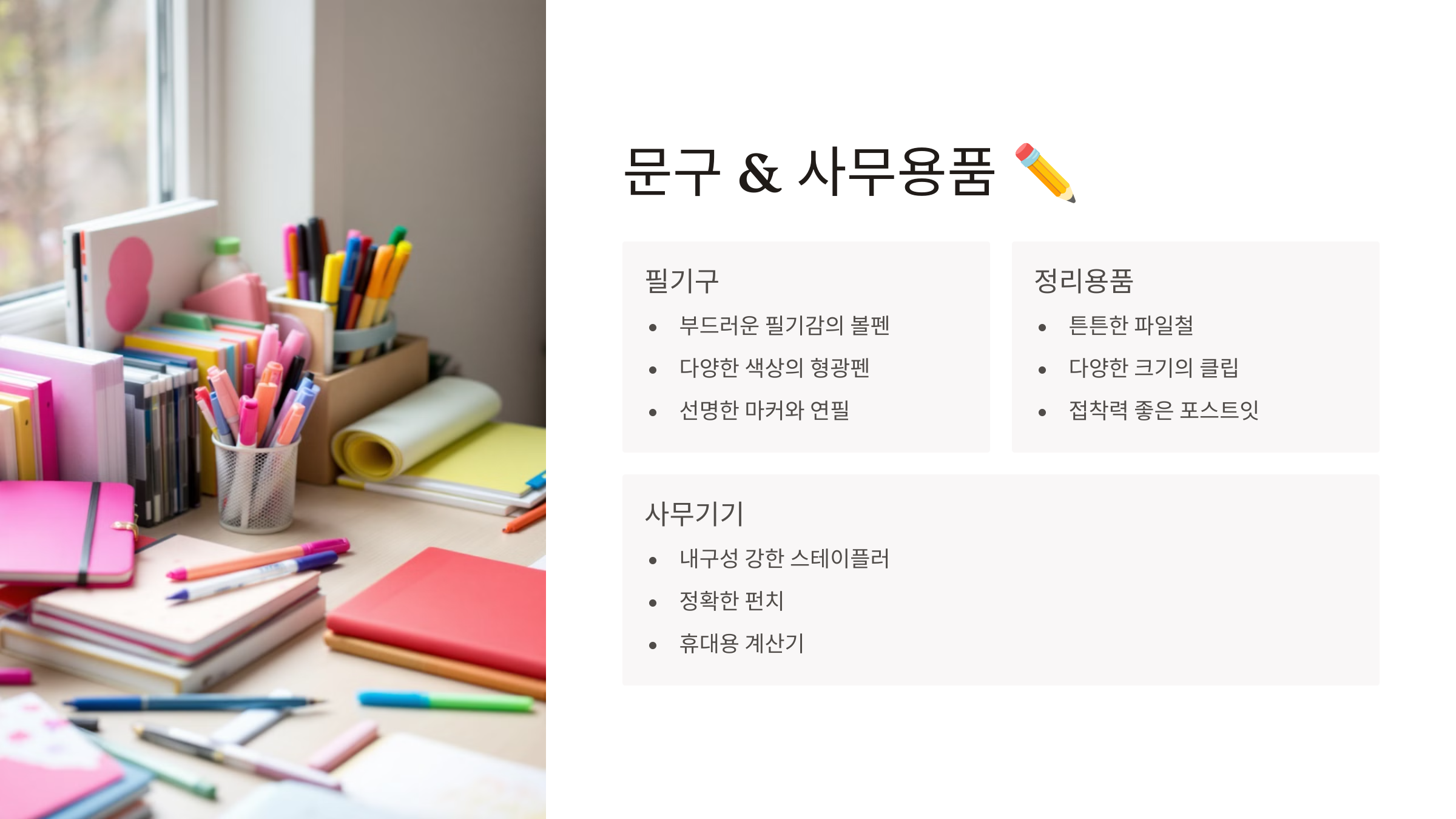 다이소는 학생이나 직장인들에게도 최고의 문구 & 사무용품 천국이에요! 저렴하면서도 퀄리티 좋은 제품들이 많아서 꼭 챙겨야 해요.