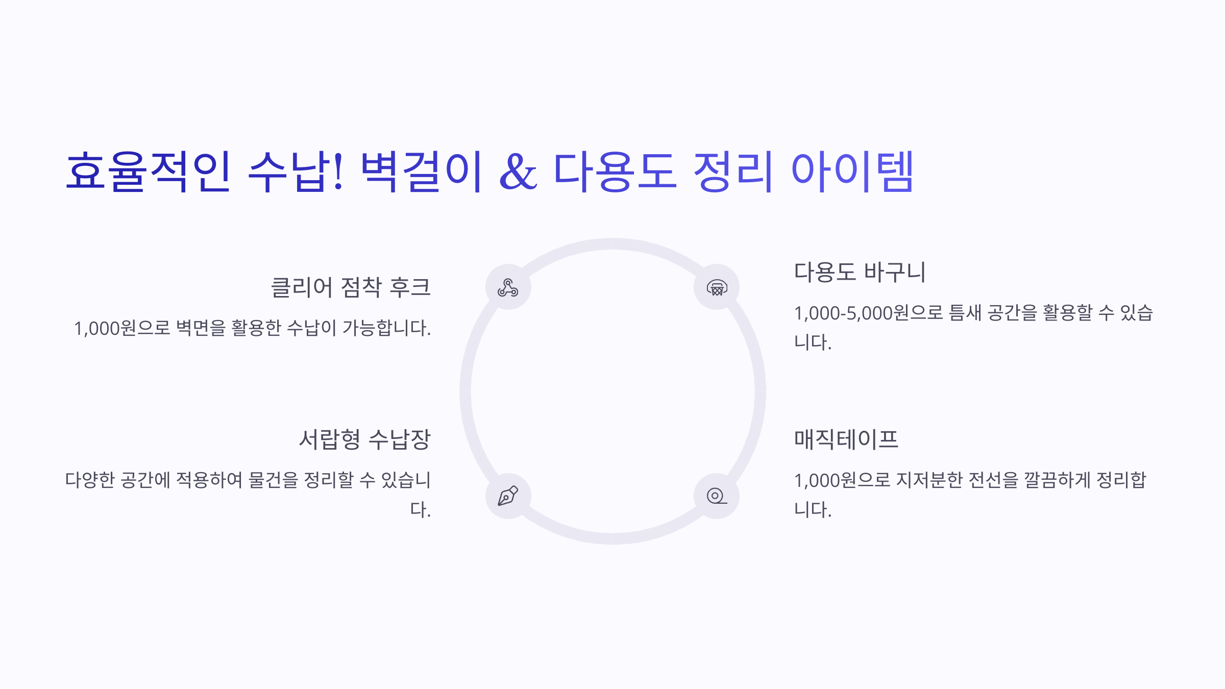 A8. 벽걸이 수납 바구니, 다용도 후크, 접이식 정리대가 공간 활용에 좋아요! 🏠