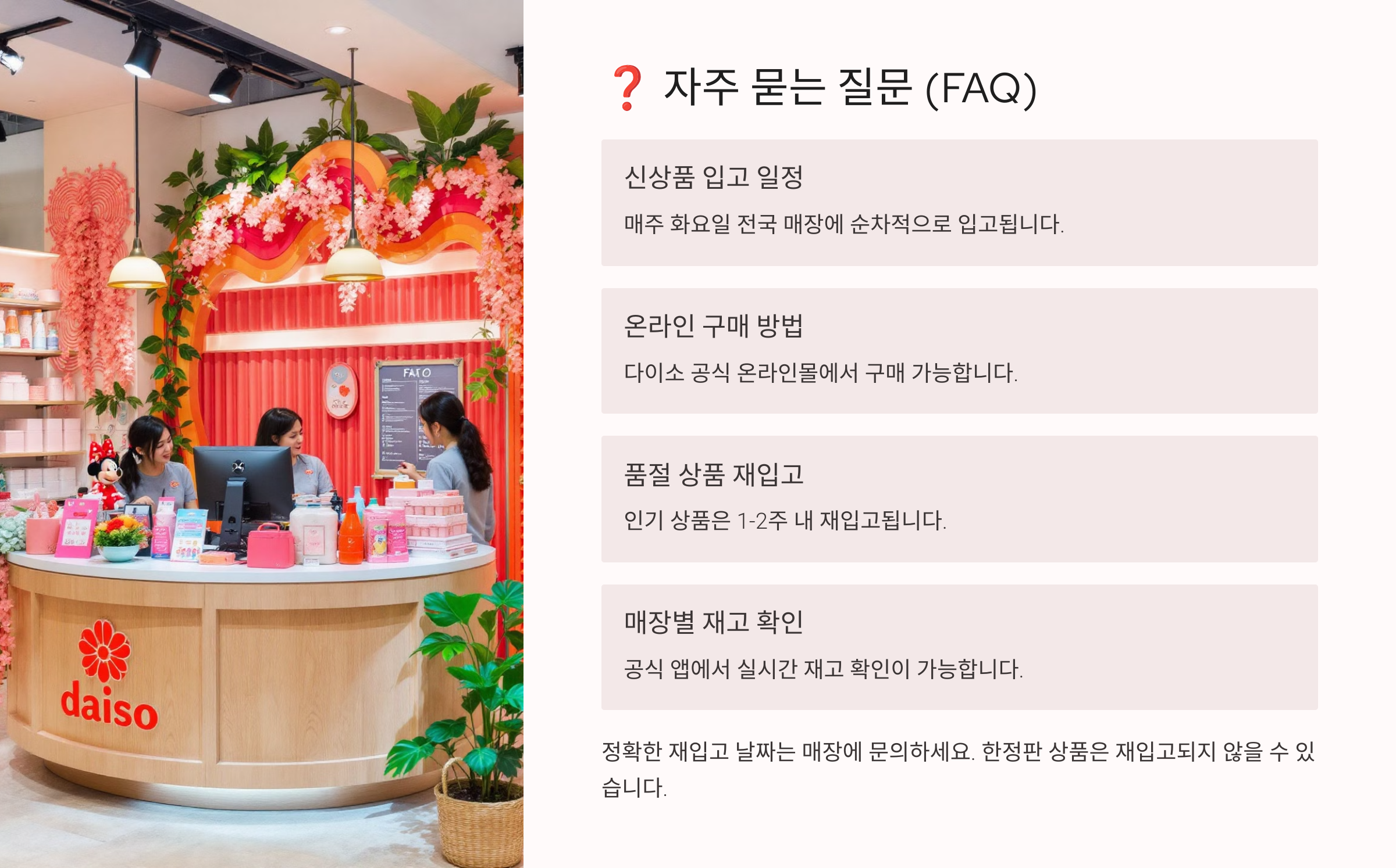 A5. 직원 추천템은 매장 직원에게 직접 물어보거나, 다이소 공식 SNS(인스타그램, 블로그)에서 확인할 수 있어요. 인기 상품은 매장 내 별도 진열대에 놓여 있는 경우도 많아요.