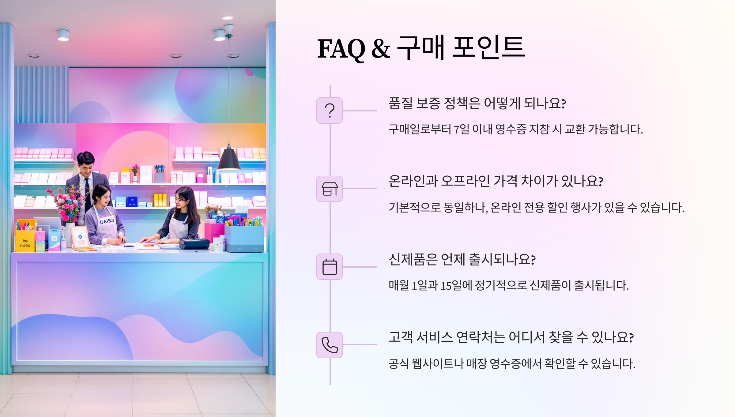 항목 다이소 제품 브랜드 제품 가격 ₩1,000~₩5,000 ₩5,000 이상 디자인 심플 & 귀여운 스타일 고급스럽고 세련된 스타일 필기감 기본적인 필기감 제공 전문가용 필기감 이처럼 다이소 문구류는 저렴한 가격에 다양한 디자인과 기본적인 필기감을 제공해서 많은 사람들이 찾고 있어요! ✨🖊️