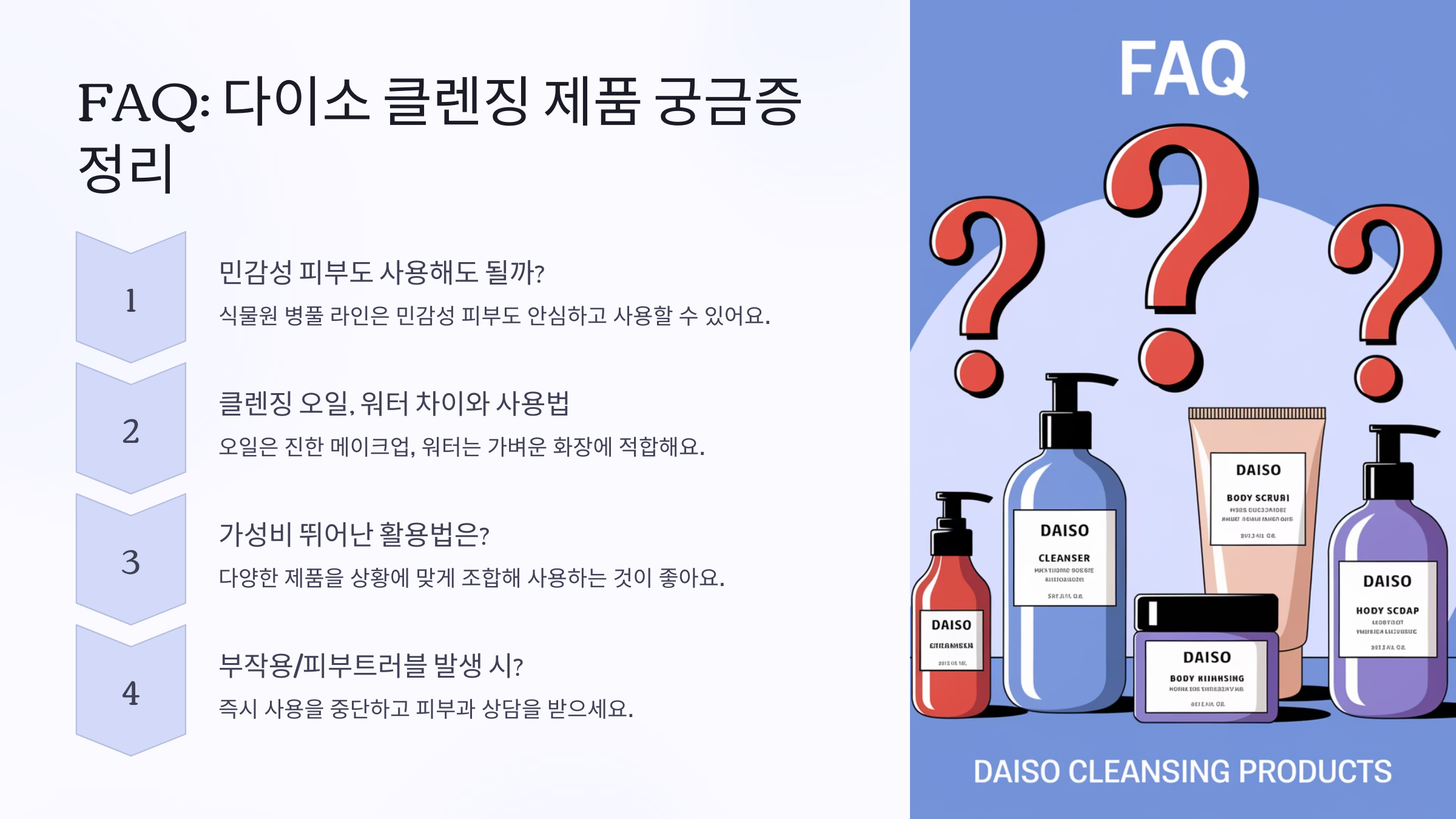 이렇게 사용하면 더 적은 비용으로 더 큰 효과를 볼 수 있어요! 🎯 그럼 마지막으로 다이소 클렌징 제품에 대한 궁금증을 해결해 줄 FAQ를 확인해 볼까요? 😊