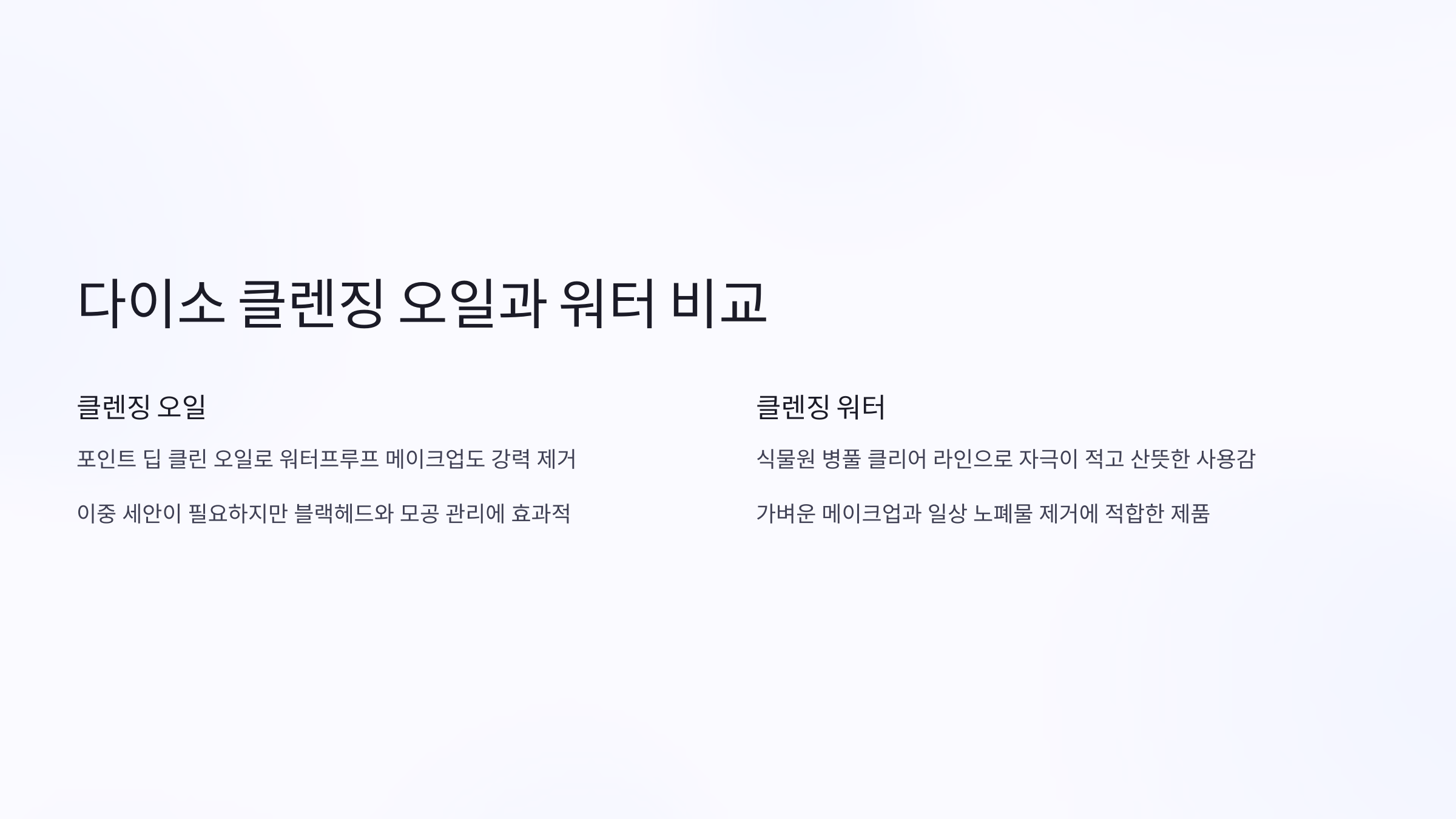 - 💦 세정력: 클렌징 오일 & 딥클렌징 제품은 강력, 클렌징 워터는 가벼운 메이크업용